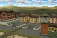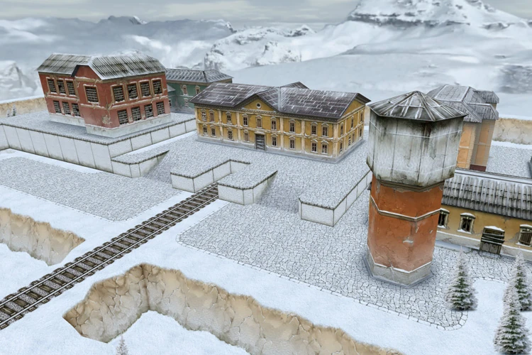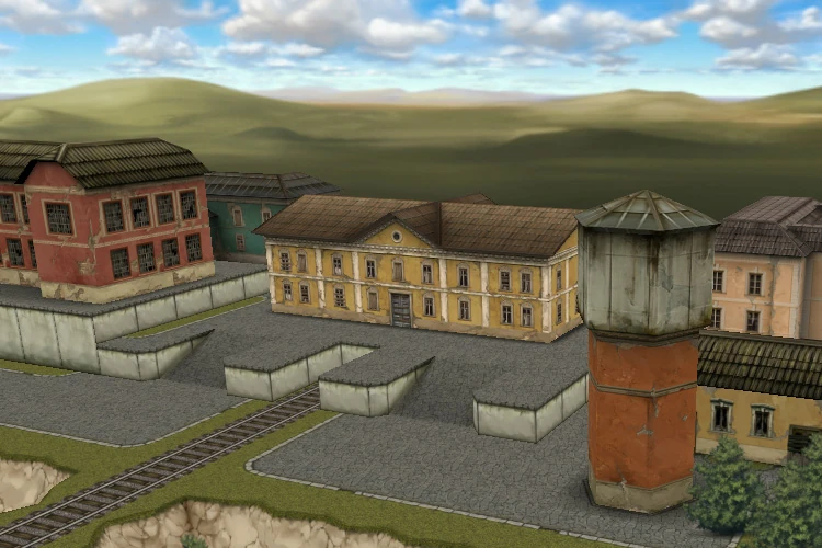 Карта представляет собой небольшой городок, проходящий мимо железной дороги. На стороне синих практически всё пространство занимает возвышение с синей базой. На возвышении находятся старые четырёхэтажные дома и флаг, вокруг также несколько спусков, ведущих на ровные участки земли.
