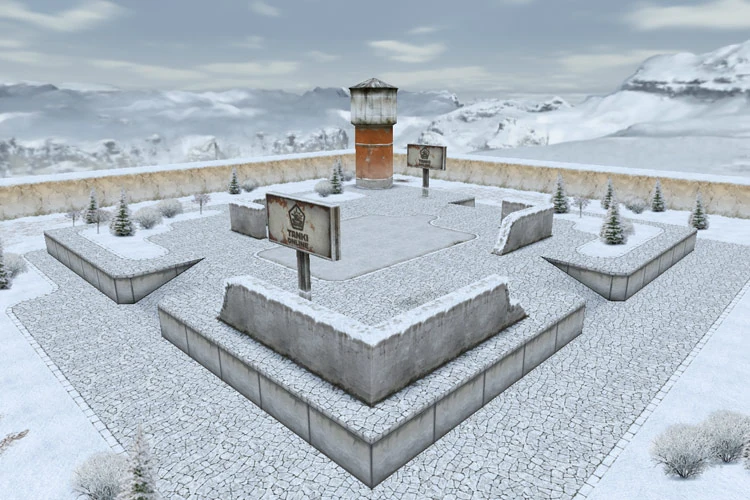 Слева и справа расположены базы команд с флагом и несколькими домами. В центре стоит небольшое возвышение, на которое можно заехать — это центр карты. Там расположена точка A (остальных точек в режиме CP на песочнице нету: борьба идёт за одну).