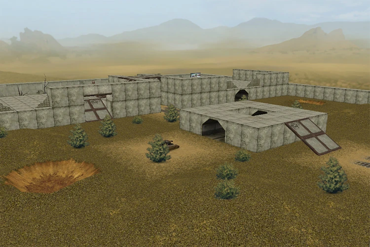 Карта представляет собой большое просторное пространство. Слева и справа располагаются две крепости, соответствующие красной и синей базе. В центре находится большое поле, усеянное холмами и ямами с редкими деревьями. Также там выстроено небольшое бетонное сооружение, которое ведёт в тоннель. По этому туннелю можно пробраться на ту или иную базу.