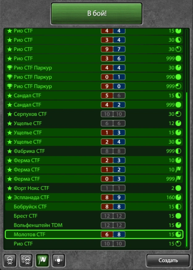 (Выбор режима игры) — представлен четырьмя квадратными кнопками, символизирующим разные режимы игры. Квадратики можно без проблем снимать и включать (при включении загораются зелёным). Данная опция предназначена для сортировки игр по режимам игры и отсеивания «ненужных». Обозначение кнопок-квадратиков: череп — DM два черепа — TDM, флаг — CTF, точка — CP.