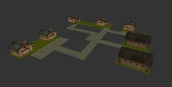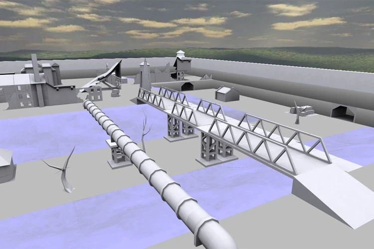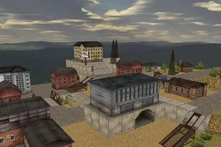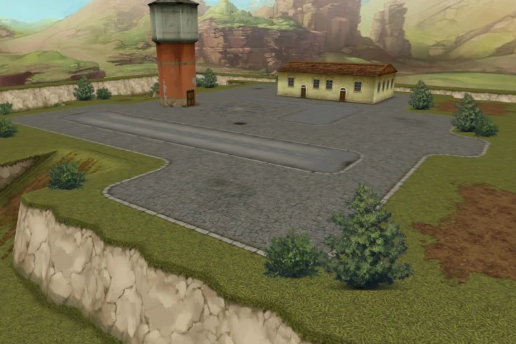 Карта представляет собой небольшую платформу с элементами травы, грязи, кирпичной кладки и цветочной клумбы. На карте находится несколько городских элементов в виде двух водонапорных башен, кирпичного забора и небольшого мостика. В противоположной стороне от мостика находится мост побольше, который состоит из отдельных частей.