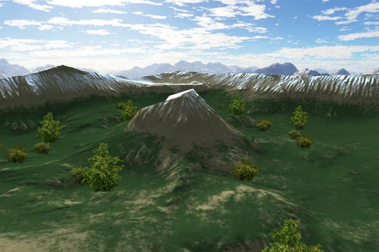 Сама же карта имела форму горы, В её центре находилась небольшая горка. На границах карты также находилась горная возвышенность, а между центром и границей находится зеленая низменность с небольшими кустарниками.