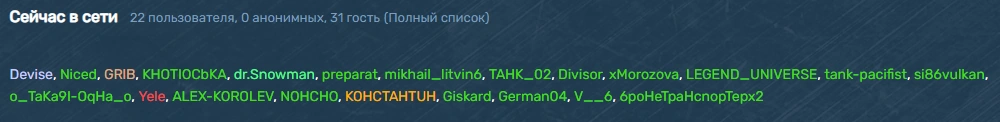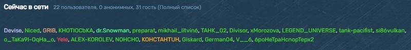 Отображается на Главной странице форума. Является частью страницы «Пользователи в сети», отличия: здесь не отображаются неавторизованные пользователи, а также не показываются последние действия игроков на форуме. В данном разделе пользователь может пробежаться по никам других посетителей, которые прямо сейчас просматривают те или иные страницы форума.