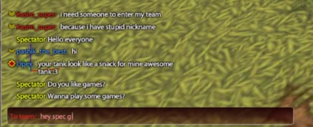- Ранее, до релиза 3 октября 2014 года, в боевом чате игрок по умолчанию мог писать не своей команде, а всем игрокам, а поэтому общий чат был значительно популярнее командного (сейчас всё наоборот). Чтобы перейти в командный чат, нужно было, не открывая общий чат, нажать на латинскую букву T (Е на русской раскладке). Сообщения командного чата вместо характерного сейчас синего либо красного цвета имели перед собой пометку [TEAM]. В режиме DM кнопка T также активировала общий чат.