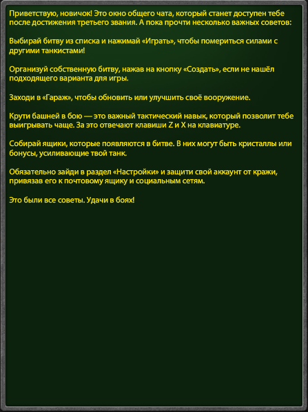 При этом, если боевой чат игрок может всегда просматривать, даже не имея звания ефрейтора, то лобби-чат до достижения данного звания закрыт. На его месте отображаются основные советы для новичка.