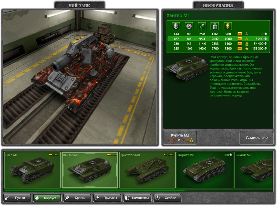 По мере повышения звания и накопления кристаллов игрок приобретает новые пушки, корпуса и краски или улучшает имеющиеся (имеется в виду повышение модификации: микропрокачек в игре нет).